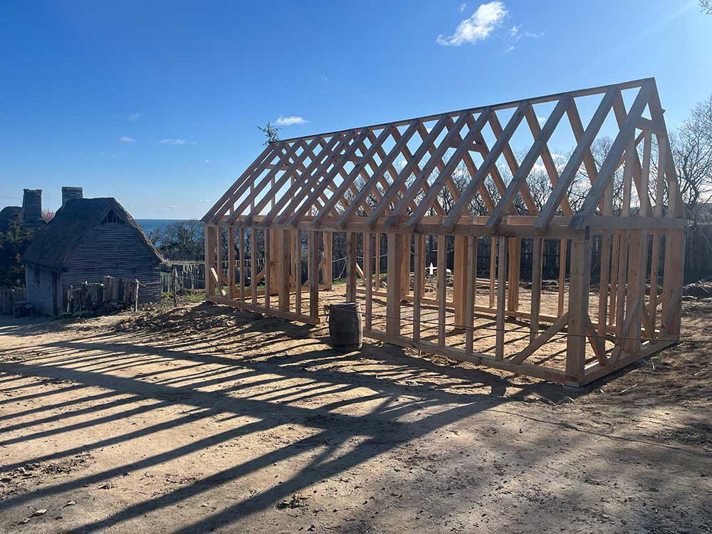 After the team at the museum prepared the site, we came in and had a wonderful time putting up this structure, with a little bit of equipment, but mainly by hand. Once fully installed the building has slowly gotten its finishing touches as the pilgrims in the exhibit dawn their traditional garb and tools so they can show the visitors how the work would have been done back in the 17th century.